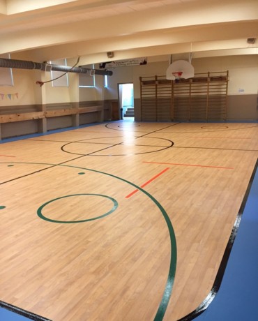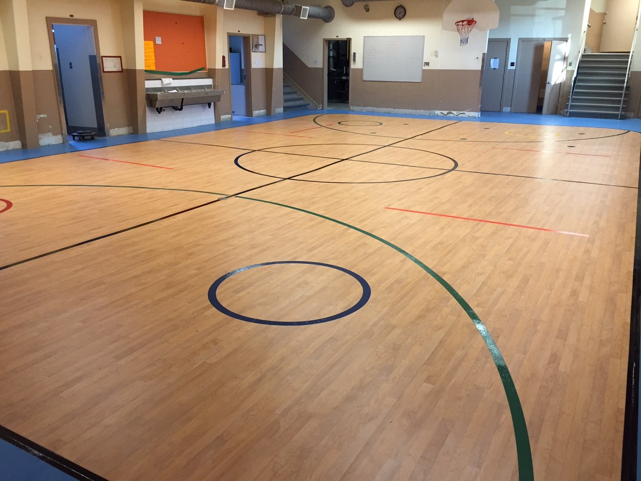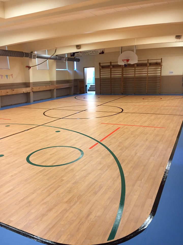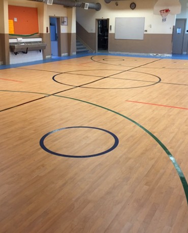 Nouveau revêtement de plancher et lignes de jeux dans le gymnase de l'école Notre-Dame-des-Prairies à Trois-Rivières